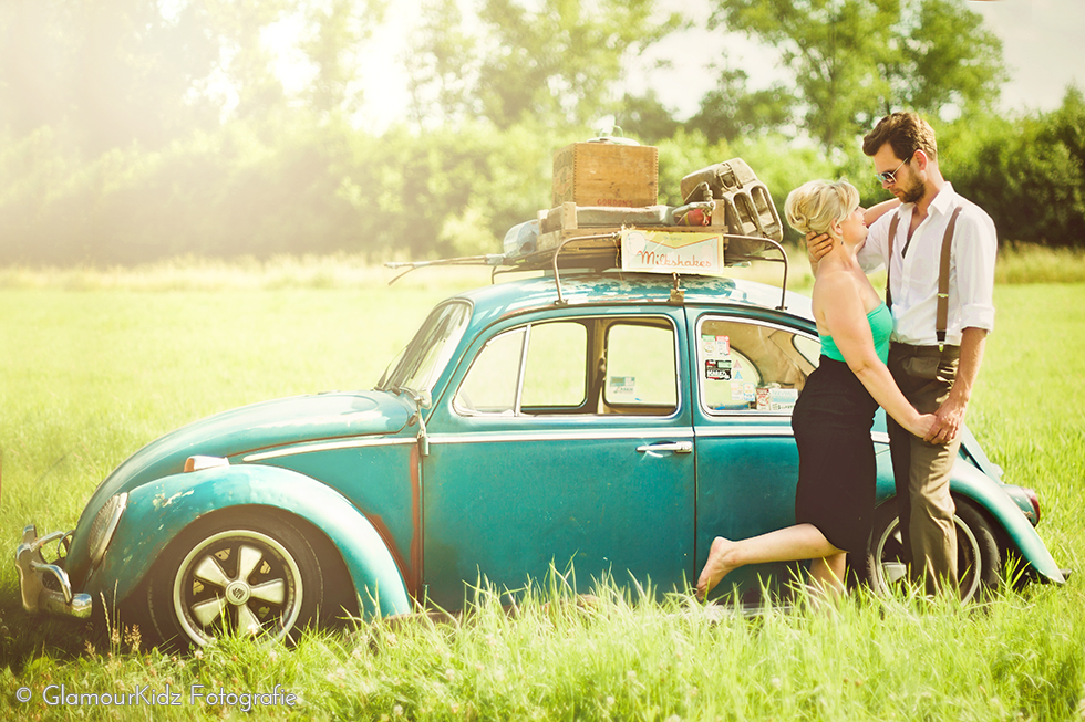 Vintage Loveshoot van een aanstaande bruid en bruidegom - bruidsreportage, huwelijk, Apeldoorn, Klarenbeek, fotoreportage, VW, Kever